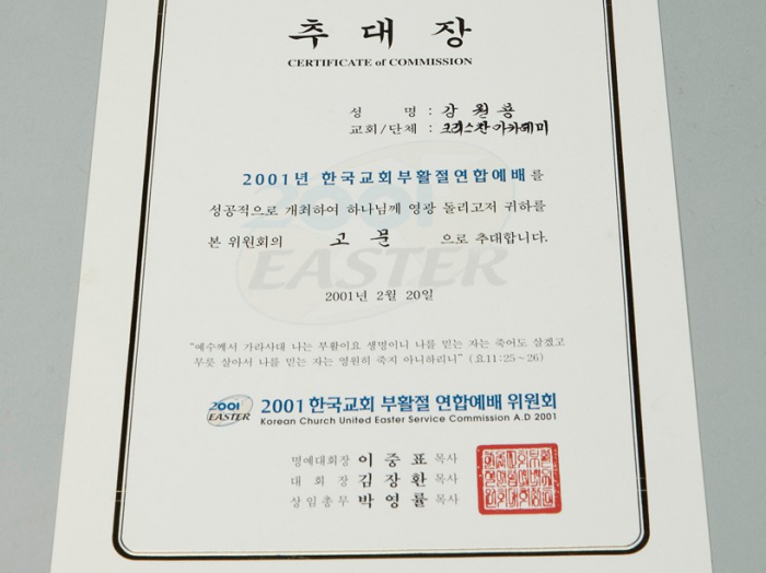2001 한국교회 부활절연합예배위원회 고문 추대장
