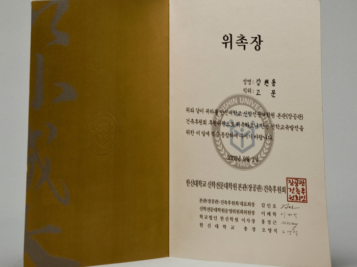 한신대학교 신학전문대학원 본관(장공관) 건축후원회 고문 위촉장