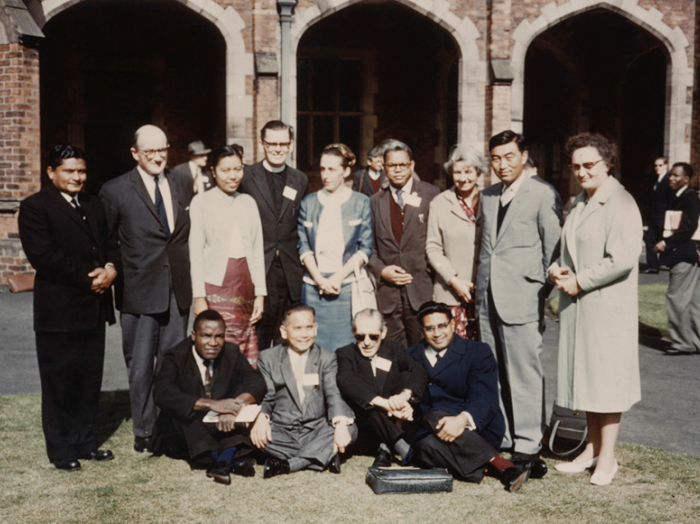 아카데미하우스 방문. 독일 국회의원 일행과 그들에게 아카데미 하우스에서 바라보이는 도봉산과 백운대 경치를 설명하고 있는 강원용 원장