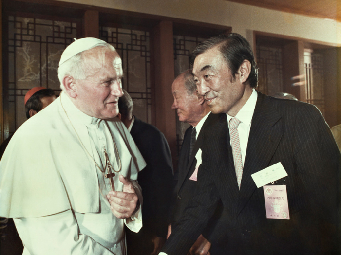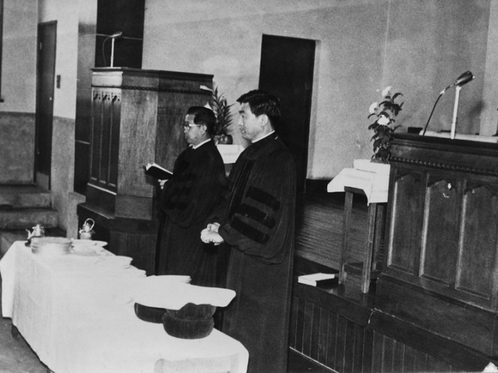 경동교회 성찬례 집례하는 김재준 목사와 강원용 목사