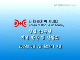 창립40주년 기념만찬 및 간담회(올림피아 호텔) 작성일 : 2011.06.29 조회수 : 23 공유하기 페이스북으로 공유하기 페이스북으로 공유하기 URL 강원용 대화문화아카데미 명예이사장, 박종화 대화문화아카데미 이사장, 박경서 인권대사, 정의숙 이화학당 이사장, 이어령 박사, 남재희 전 국회의원, 신인령 이화여대 총장, 이부영 열린우리당 의장, 황한식 부산대 교수, 노정현 교수, 소흥렬 교수, 김남조 시인 등의 아카데미 인연 소개 / 영상물 상영 / 빛바람중창단 합창 / 조향록 목사 기도 / 서영훈 선생 건배사 등의 순서로 만찬과 간담회 진행 관련일시 2005.05.07 영상 이전 한신대 신입생을 위한 내일&리더십 캠프 다음 1차 멘토 포럼 목록으로