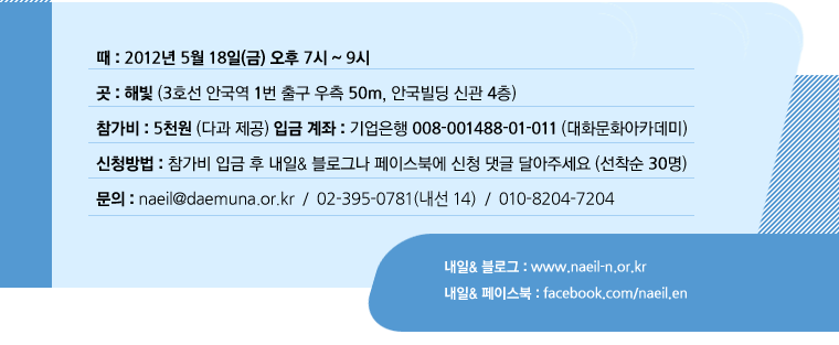 출판간행물 내일& Talk -내 인생의 터닝포인터 I 2012.05.10 조회수 : 51 공유하기 페이스북으로 공유하기 페이스북으로 공유하기 URL 태그 내일엔대화문화아카데미대학생프로그램 이전 내일&Talk- 내 인생의 터닝포인터I 다음 내가 믿는 부활이 남긴 메시지 목록으로