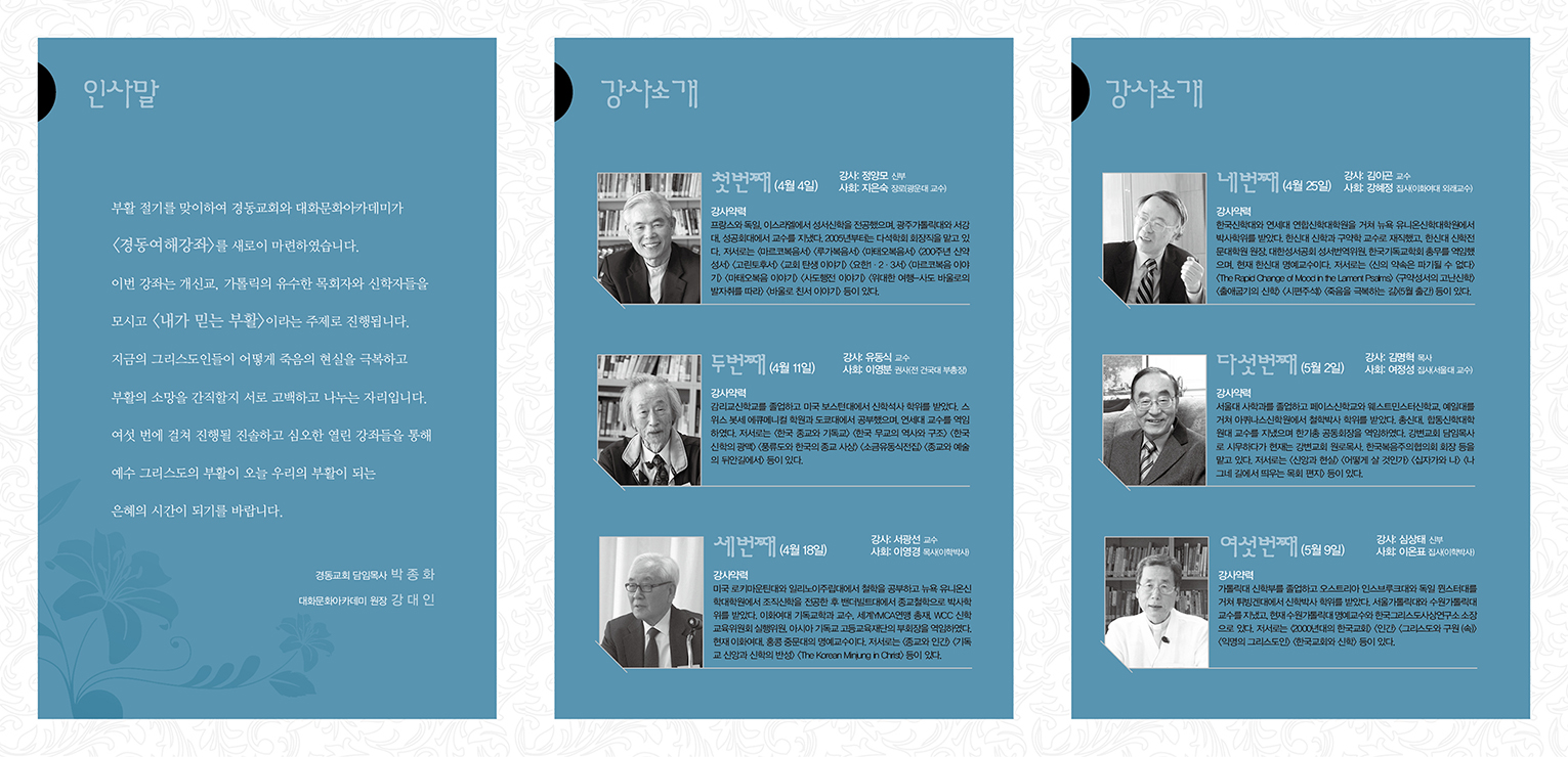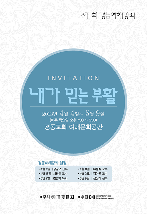 경동교회와 대화문화아카데미가 함께 경동여해강좌 내가 믿는 부활>을 마련했습니다.