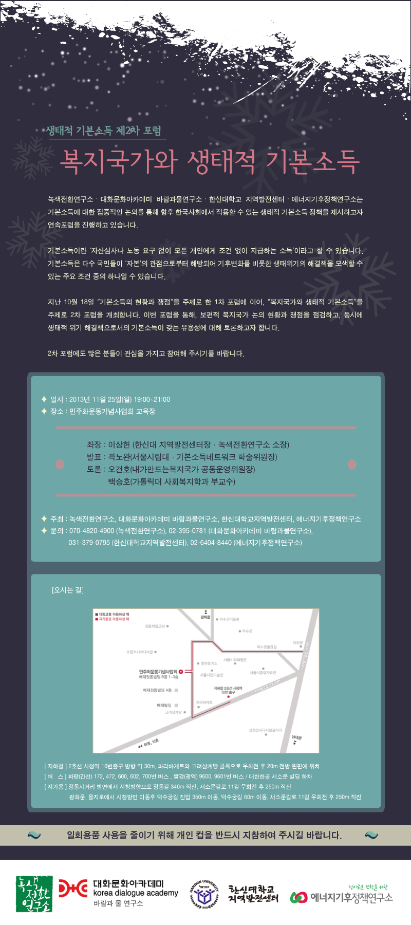 대화문화아카데미 생태적 기본소득 제2차포럼_복지국가와 생태적 기본소득 2013.11.21 조회수 : 23 공유하기 페이스북으로 공유하기 페이스북으로 공유하기 URL 태그 기본소득 이전 ★ 국제 공통어 에스페란토에 얽힌 희망과 고난의 역사 - <위험한 언어>(울리히 린스)의 다음 [세미나] 가따리, 네그리, 들뢰즈, 마르크스, 영어, 페데리치 세미나에 초대합니다. 목록으로