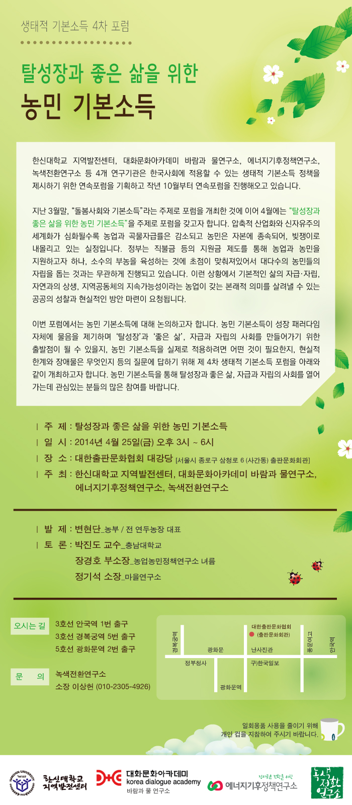 대화문화아카데미 생태적 기본소득 4차포럼-탈성장과 좋은 삶을 위한 농민 기본소득 2014.04.21 조회수 : 34 공유하기 페이스북으로 공유하기 페이스북으로 공유하기 URL '탈성장과 좋은 삶을 위한 농민 기본소득'을 주제로 한 생태적 기본소득 4차포럼에 많은 참여 바랍니다. 태그 기본소득포럼 이전 생태적 기본소득 3차 포럼- ‘돌봄 사회와 생태적 기본소득’ 다음 대한민국 모든 기독교 성도님들께 알려드립니다!!! 목록으로