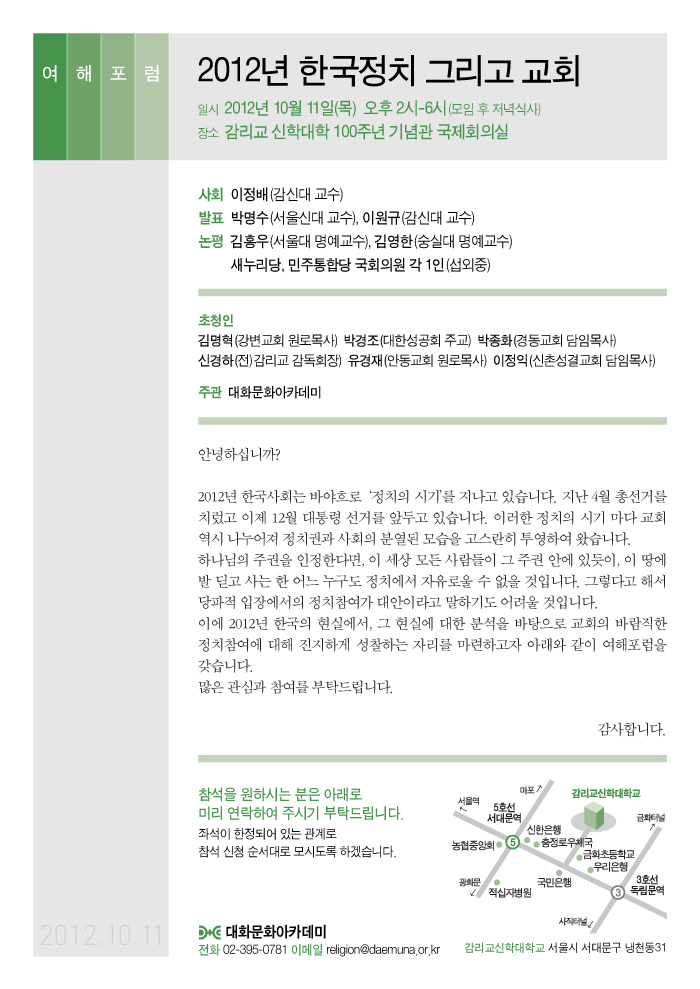 “2012년 한국정치 그리고 교회"를 주제로 여해포럼이 열립니다. 많은 관심과 응원바랍니다