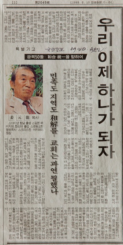 광복50돌 화합 통일을 향하여 작성일 : 2011.06.29 조회수 : 16 공유하기 페이스북으로 공유하기 페이스북으로 공유하기 URL 해방과 분단의 50년을 계기로 교회부터 참으로 회개하고 화해의 선교에 충실해야 한다. 이번 8.15가 새로운 해방의 날로 희망을 갖는 것은 지난 50년간 우리를 망하지 않게 해주신 하나님의 은혜를 믿는 것과 우리가 복음의 씨를 뿌려야 할 한국의 민중 속에는 옥토에 비유할 문화적 잠재능력이 있기 때문이다. 관련일시 1995.08.14 노트 국민일보 태그 신문기사 이전 한신대 신입생을 위한 내일&리더십 캠프 다음 1차 멘토 포럼 목록으로