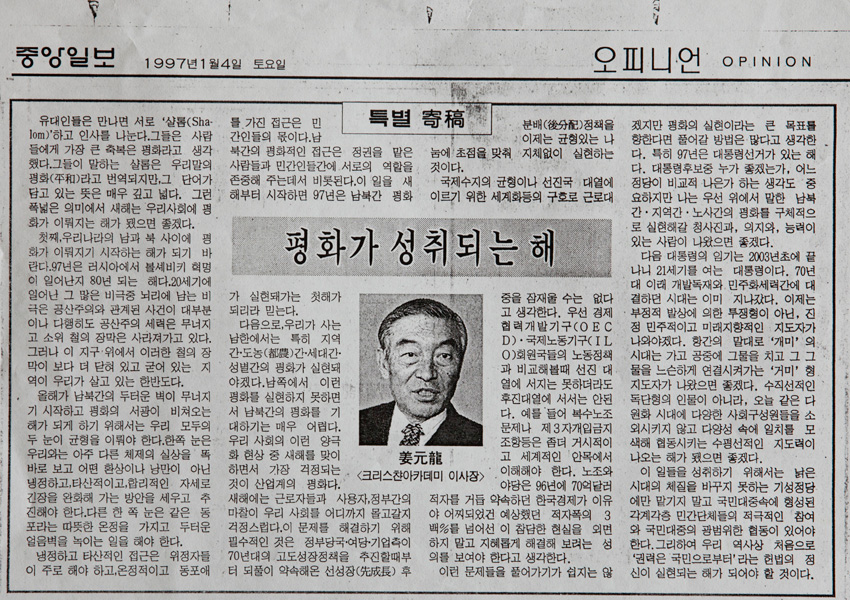 특별기고 : 평화가 성취되는 해 작성일 : 2011.06.29 조회수 : 22 공유하기 페이스북으로 공유하기 페이스북으로 공유하기 URL 97년은 대통령선거가 있는 해다. 나는 남북간, 지역간, 노사간의 평화를 구체적으로 실현해갈 청사진과 의지와 능력이 있는 사람이 나왔으면 좋겠다. 수직선적인 독단형의 인물이 아니라, 오늘 같은 다원화 시대에 다양한 사회구성원들을 소외시키지 않고 다양성 속에 일치를 모색해 협동시키는 수평선적인 지도력이 나오는 해가 됐으면 좋겠다. 관련일시 1997.01.04 노트 중앙일보 태그 신문기사 이전 한신대 신입생을 위한 내일&리더십 캠프 다음 1차 멘토 포럼 목록으로