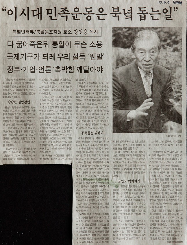 특별인터뷰 : 북녘동포지원 호소 작성일 : 2011.06.29 조회수 : 15 공유하기 페이스북으로 공유하기 페이스북으로 공유하기 URL 우리가 북한동포를 도와야 할 세 가지 이유, 첫째, 인간의 도리이고 둘째, 같은 민족, 셋째, 종교인의 사명이다. 이 시대 최대의 민족운동이 있다면 그것은 아사 위기에 처한 북쪽의 동포를 돕는 일일 것이다. 관련일시 1997.04.07 노트 한겨레신문 태그 신문기사 이전 한신대 신입생을 위한 내일&리더십 캠프 다음 1차 멘토 포럼 목록으로