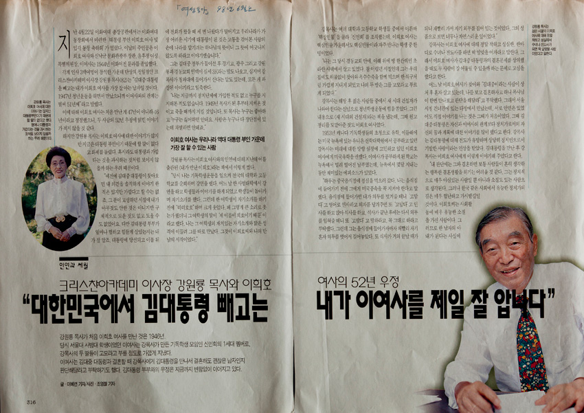 인연과 세월 : 강원용 목사와 이희호 여사의 52년 우정 작성일 : 2011.06.29 조회수 : 31 공유하기 페이스북으로 공유하기 페이스북으로 공유하기 URL 서울대 사범대 학생이었던 이여사는 강목사가 만든 기독학생 모임인 신인회의 1세대 멤버로, 강목사의 두 딸들이 고모라고 부를 정도로 가깝게 지냈다. 이여사는 김대중 대통령과 결혼할 때 강목사에게 김대통령을 만나서 결혼해도 괜찮은 남자인지 판단해달라고 부탁하기도 했다. 관련일시 1998.06.01 노트 여성동아 태그 신문기사 이전 한신대 신입생을 위한 내일&리더십 캠프 다음 1차 멘토 포럼 목록으로