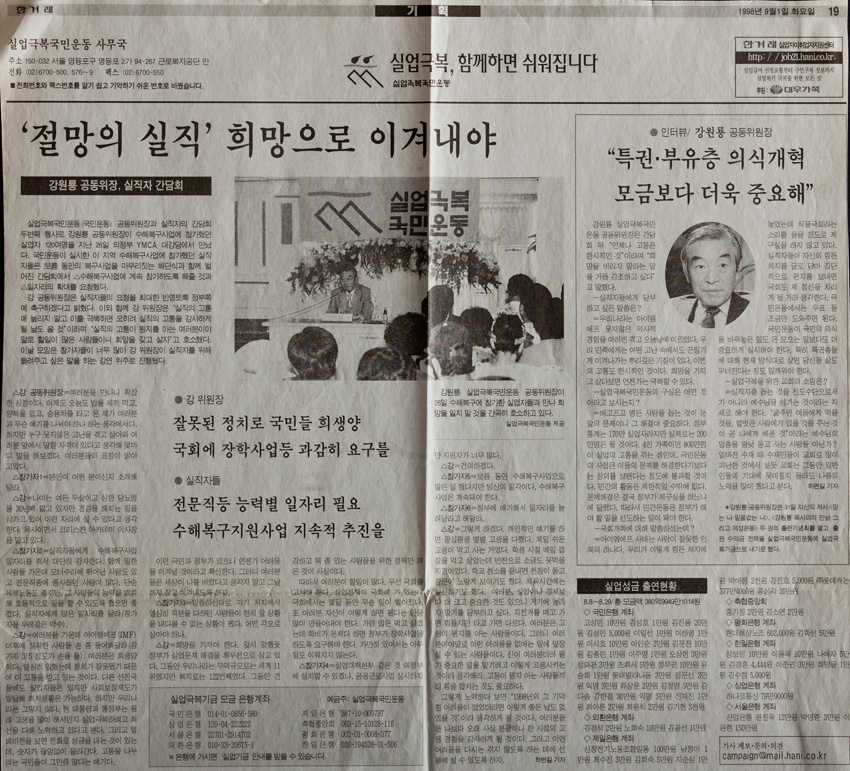 실업극복 함께하면 쉬워집니다 작성일 : 2011.06.29 조회수 : 23 공유하기 페이스북으로 공유하기 페이스북으로 공유하기 URL 우리나라는 아이엠에프 못지않은 역사적 경험을 여러번 겪고 오늘날에 이르렀다. 우리 민족에게는 어떤 고난 속에서도 끈질기게 이겨나가는 뿌리깊은 기질이 있다. 이번의 고통도 한시적인 것이다. 희망을 가지고 살다보면 언제가는 극복할 수 있다. 관련일시 1998.09.01 노트 한겨레신문 태그 신문기사 이전 한신대 신입생을 위한 내일&리더십 캠프 다음 1차 멘토 포럼 목록으로