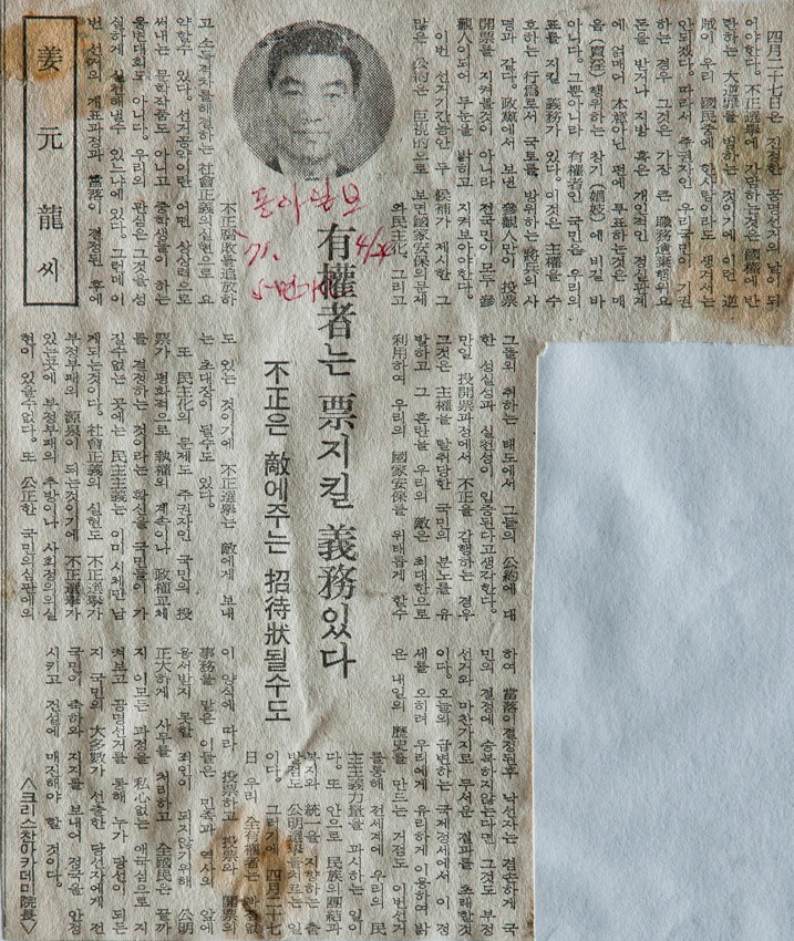 유권자는 표 지킬 의무 있다 작성일 : 2011.06.29 조회수 : 17 공유하기 페이스북으로 공유하기 페이스북으로 공유하기 URL 다가올 선거에서 주권자인 우리 국민이 기권을 하는 경우 그것은 가장 큰 직무유기 행위요 돈을 받거나 지방 혹은 개인적인 정실 관계에 얽매어 본의 아닌 편에 투표하는 것은 매음행위하는 창기에 비길 바 아니다. 유권자인 국민은 우리의 표를 지킬 의무가 있으며 이는 주권을 수호하는 행위로서 국토를 방위하는 장병의 사명과 같다. 관련일시 1971.04.24 노트 동아일보 태그 신문기사 이전 한신대 신입생을 위한 내일&리더십 캠프 다음 1차 멘토 포럼 목록으로