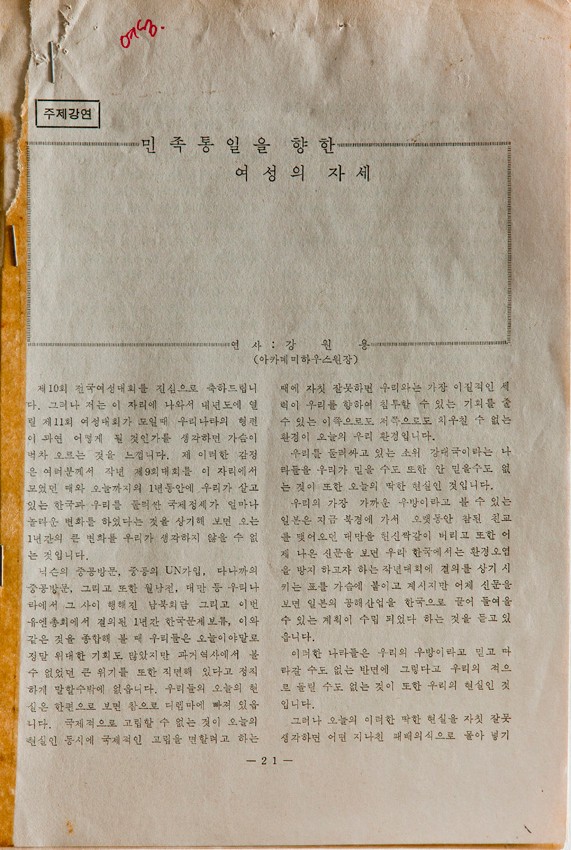 민족통일을 향한 여성의 자세 (제10회 여성대회 주제강연) 작성일 : 2011.06.29 조회수 : 19 공유하기 페이스북으로 공유하기 페이스북으로 공유하기 URL 60년대의 여성운동의 방향과 많은 프로그램들이 여가선용, 안일 위주의 부르주아적인 풍토조성의 문화활동으로서의 여성운동이었다면, 70년대의 여성운동은 민족통일이라는 거창한 과제를 여성운동의 방향으로 삼고 이를 위해 여성단체들의 자체 정비와 육성강화를 부탁하고 싶다. 관련일시 1972.09.01 노트 여성 태그 신문기사 이전 한신대 신입생을 위한 내일&리더십 캠프 다음 1차 멘토 포럼 목록으로