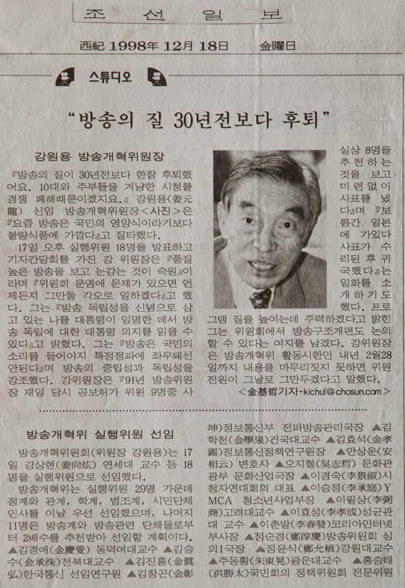 강원용 방송개혁위원장 작성일 : 2011.06.29 조회수 : 18 공유하기 페이스북으로 공유하기 페이스북으로 공유하기 URL 방송의 질이 30년 전보다 한참 후퇴했어요, 10대와 주부들을 겨냥한 시청률 경쟁폐해 때문이겠지요. 요즘 방송은 국민의 영양식이라기보다 불량식품에 가깝다. 방송개혁위 활동 시한인 내년 2월 28일까지 내용을 마무리짓지 못하면 위원 전원이 그날로 그만두겠다. 관련일시 1998.12.18 노트 조선일보 태그 신문기사 이전 한신대 신입생을 위한 내일&리더십 캠프 다음 1차 멘토 포럼 목록으로