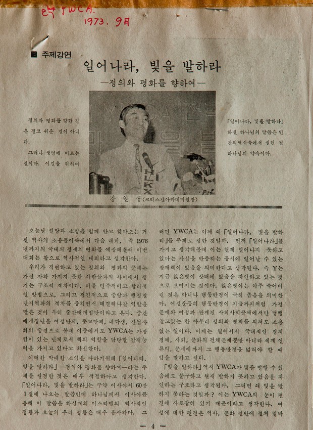 주제강연 : 일어나라, 빛을 발하라 작성일 : 2011.06.29 조회수 : 17 공유하기 페이스북으로 공유하기 페이스북으로 공유하기 URL 정의와 평화를 향한 길은 결코 쉬운 길이 아니다. 그러나 생명에 이르는 길이다. 이 길을 위하여 “일어나라, 빛을 발하라” 하신 하나님의 말씀은 인간의 역사 속에서 실현될 하나님의 약속이다. 관련일시 1973.09.01 노트 한국YWCA 태그 신문기사 이전 한신대 신입생을 위한 내일&리더십 캠프 다음 1차 멘토 포럼 목록으로