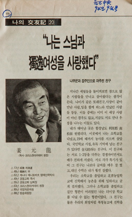 나의 교우기 : 나는 스님과 독일 여성을 사랑했다 작성일 : 2011.06.29 조회수 : 21 공유하기 페이스북으로 공유하기 페이스북으로 공유하기 URL 경동교회 만든 선린당 친구들, 나를 구해준 가나안농군학교의 김용기, 酒님의 종 조광운, 청담/법정과의 인연, 아버지와 같았던 고 김재준 목사 / 속이 탁 트인 윤길중 전국회부의장, 우정을 나눌 수 있었던 독일 여인 에바 강스, 내 생명을 지켜준 영아네/장순옥/김옥분 관련일시 1993.09.01 노트 월간중앙 태그 신문기사 이전 한신대 신입생을 위한 내일&리더십 캠프 다음 1차 멘토 포럼 목록으로