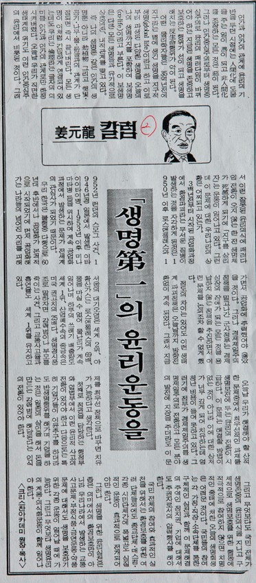 강원용 칼럼 : 생명 제일의 윤리운동을 작성일 : 2011.06.29 조회수 : 20 공유하기 페이스북으로 공유하기 페이스북으로 공유하기 URL 생명을 위한 윤리실천은 좁은 의미에서의 환경보호만이 아니라 우리나라에서 발생하는 교통사고 문제, 부정식품, 금연운동, 약품문제에 대해서도 생명을 보호하기 위한 각종 운동이 일어날 때에 가능하다. 무엇보다 생명윤리의 계몽, 의식화운동이 함께 일어나야 한다. 관련일시 1994.06.17 노트 경향신문 태그 신문기사 이전 한신대 신입생을 위한 내일&리더십 캠프 다음 1차 멘토 포럼 목록으로