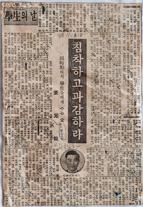 침착하고 과감하라 - 현 시점에서 학생들에게 주는 글 작성일 : 2011.06.29 조회수 : 18 공유하기 페이스북으로 공유하기 페이스북으로 공유하기 URL 광주학생사건 30주년 기념일에 오늘의 시점에서 그날의 시점과 대화라는 자세를 가져야 한다. 학생들은 오늘의 학원을 좀먹고 있는 무기력한 허무주의 사조, 소시민적 안전주의 사조, 학원공동체를 위협하는 소수의 소영웅주의를 배격하고 그날의 광주학생사건들과 함께 우리 동포를 짓밟는 어떠한 부정한 세력과도 언제나 과감하게 싸울 수 있다는 굳은 결의가 항상 살아 있어야 한다. 관련일시 1963.11.03 노트 한국일보 태그 신문기사 이전 한신대 신입생을 위한 내일&리더십 캠프 다음 1차 멘토 포럼 목록으로