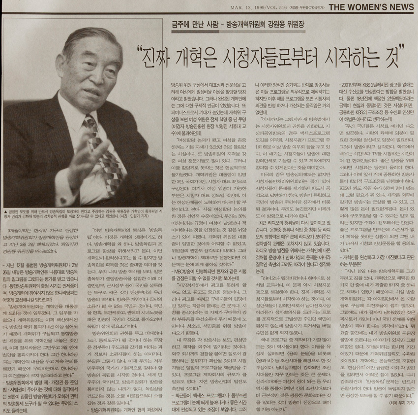 금주에 만난 사람 : 방송개혁위원회 강원용 위원장 작성일 : 2011.06.29 조회수 : 16 공유하기 페이스북으로 공유하기 페이스북으로 공유하기 URL 개혁에는 본능적으로 저항하고 현상유지에만 급급한 사회 각 방면을 접하면서 어려운 점이 많았다. 다시 강조하건대 방송독립 문제는 반드시 관철시켜야 한다. 방송이 독립되지 않으면 공정한 보도를 할 수 없기 때문이다. 관련일시 1999.03.12 노트 여성신문 태그 신문기사 이전 한신대 신입생을 위한 내일&리더십 캠프 다음 1차 멘토 포럼 목록으로