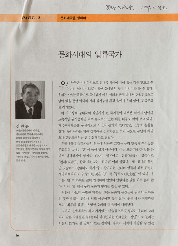 문화시대의 일류국가 작성일 : 2011.06.29 조회수 : 15 공유하기 페이스북으로 공유하기 페이스북으로 공유하기 URL 우리 민족에는 끈질긴 생명력과 멋, 즉 풍류도가 있다. 우리는 멋의 가치를 깊이 인식하여 멋있다 멋없다는 말을 아주 흔히 쓴다. 이런 멋에서 우리 문화의 뿌리를 찾을 수 있다. 관련일시 1999.12.01 노트 뜻모아소리모아 태그 신문기사 이전 한신대 신입생을 위한 내일&리더십 캠프 다음 1차 멘토 포럼 목록으로