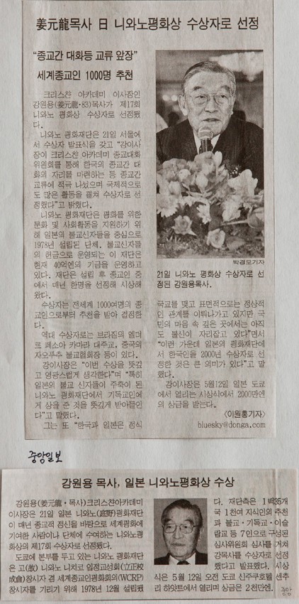 강원용 목사 일 니와노평화상 수상자로 선정 작성일 : 2011.06.29 조회수 : 21 공유하기 페이스북으로 공유하기 페이스북으로 공유하기 URL 강원용 이사장이 크리스챤아카데미 종교대화위원회를 통해 한국의 종교간 대화의 자리를 마련하는 등 종교간 교류에 적극 나섰으며 국제적으로도 많은 활동을 펼쳐 수상자로 선정했다. 관련일시 2000.02.22 노트 동아일보 태그 신문기사 이전 한신대 신입생을 위한 내일&리더십 캠프 다음 1차 멘토 포럼 목록으로