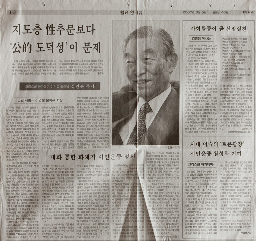 월요인터뷰 : 크리스챤아카데미 이사장 물러난 강원용 목사 작성일 : 2011.06.29 조회수 : 17 공유하기 페이스북으로 공유하기 페이스북으로 공유하기 URL 크리스챤아카데미 이사장으로 역사의 현장에서 교회란 무엇인가를 끊임없이 되뇌며 40여년 간 사회 변화의 밀알을 키워오던 강원용 목사가 이사장 직을 내놓고 2선으로 물러났다. 좌와 우, 진보와 보수의 한 가운데에서 대화와 화해를 통해 평등한 인간사회 만들기에 평생을 바치고 있는 강목사와의 인터뷰 관련일시 2000.06.05 노트 중앙일보 태그 신문기사 이전 한신대 신입생을 위한 내일&리더십 캠프 다음 1차 멘토 포럼 목록으로