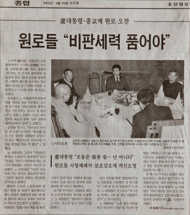 노대통령/종교계 원로 오찬 작성일 : 2011.06.29 조회수 : 20 공유하기 페이스북으로 공유하기 페이스북으로 공유하기 URL 강원용 목사는 “정부보다 무서운 게 언론이라면서 횡포를 잡는 것은 맞지만 대통령이 앞에 서지 말고 제도적으로 바로잡을 수 있는 방법을 찾는 게 좋다”고 말했다. 노대통령은 “포용은 강자가 약자에게 하는 것인데 대통령은 강자가 아니다”고 말했다. 관련일시 2003.09.20 노트 조선일보 태그 신문기사 이전 한신대 신입생을 위한 내일&리더십 캠프 다음 1차 멘토 포럼 목록으로