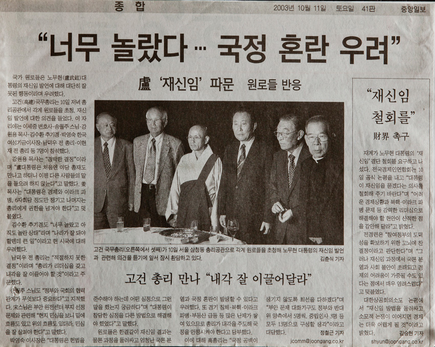 노대통령 재신임 발언 파문 원로들 반응 작성일 : 2011.06.29 조회수 : 19 공유하기 페이스북으로 공유하기 페이스북으로 공유하기 URL 노무현 대통령의 재신임 발언에 대해 강원용 목사는 “경박한 결정”이라며 “노대통령은 처음엔 야당총재도 만나고 하더니 이젠 다른 사람들의 말을 들으려 하지 않는다”며 대통령은 경제와 이라크파병, 6자회담 정도만 챙기고 나머지는 총리에게 권한을 넘겨야 한다”고 말했다. 관련일시 2003.10.11 노트 중앙일보 태그 신문기사 이전 한신대 신입생을 위한 내일&리더십 캠프 다음 1차 멘토 포럼 목록으로