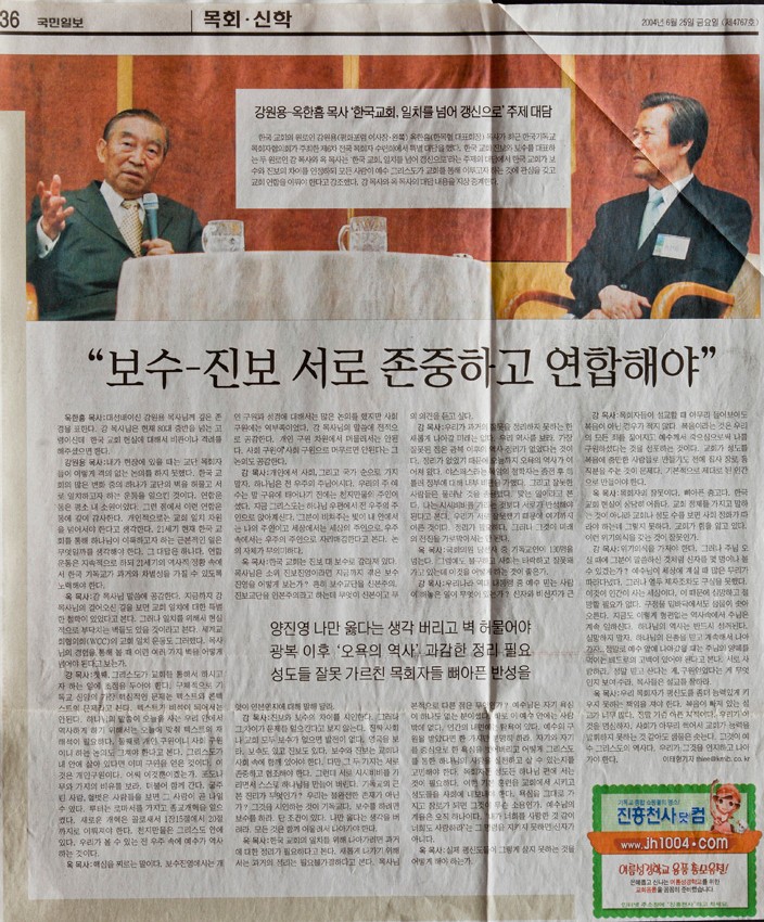강원용 - 옥한흠 목사 대담 작성일 : 2011.06.29 조회수 : 30 공유하기 페이스북으로 공유하기 페이스북으로 공유하기 URL 한국기독교 목회자협의회가 주최한 제6차 전국목회자 수련회에서 가진 특별대담에서 ‘한국교회, 일치를 넘어 갱신으로’라는 주제로 한국교회가 보수와 진보의 차이를 인정하되 모든 사람이 예수 그리스도가 교회를 통해 이루고자 하는 것에 관심을 갖고 교회연합을 이뤄야 한다고 강조했다. 관련일시 2004.06.25 노트 국민일보 태그 신문기사 이전 한신대 신입생을 위한 내일&리더십 캠프 다음 1차 멘토 포럼 목록으로