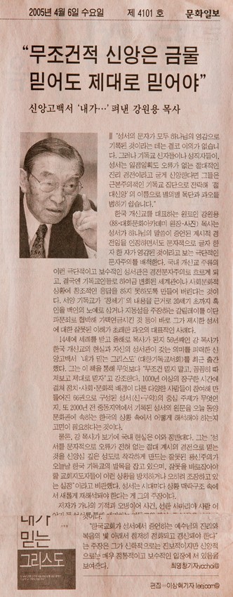신앙고백서 『내가 믿는 그리스도』 펴낸 강원용 목사 작성일 : 2011.06.29 조회수 : 17 공유하기 페이스북으로 공유하기 페이스북으로 공유하기 URL “성서의 문자가 모두 하나님의 영감으로 기록된 것이라는 데는 결코 이의가 없습니다. 그러나 기독교 신자들이나 성직자들이, 성서는 일점일획도 오류가 없는 절대적인 진리 경전이라고 굳게 신앙한다면 그들은 근본주의적인 기독교 집단으로 전락해 ‘절대 신앙’의 이름으로 독단과 과오를 범하기 쉽습니다.” 관련일시 2005.04.06 노트 문화일보 태그 신문기사 이전 한신대 신입생을 위한 내일&리더십 캠프 다음 1차 멘토 포럼 목록으로