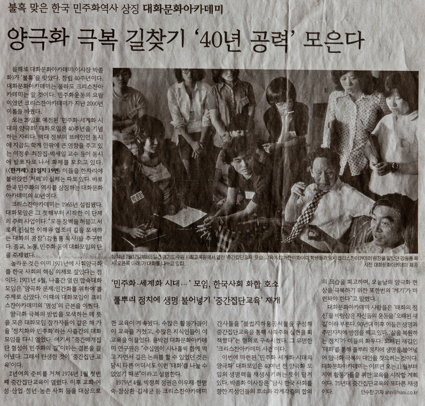 "불혹맞은 한국 민주화역사 상징 대화문화 아카데미 작성일 : 2011.06.29 조회수 : 17 공유하기 페이스북으로 공유하기 페이스북으로 공유하기 URL 올해로 대화문화아카데미가 ‘불혹’을 맞았다. 창립 40주년이다. 놀라운 것은 이미 1971년에 사회 양극화를 한국사회의 핵심의제로 짚었다는 점이다. 1971년 4월, 나흘간 열린 합숙대화모임은 ‘양극화 문제; 인간화를 위하여’를 주제로 삼았다. 이때의 대화모임이 크리스챤아카데미의 ‘명성’의 근본을 이뤘다. 관련일시 2005.01.01 노트 한겨레 태그 신문기사 이전 한신대 신입생을 위한 내일&리더십 캠프 다음 1차 멘토 포럼 목록으로