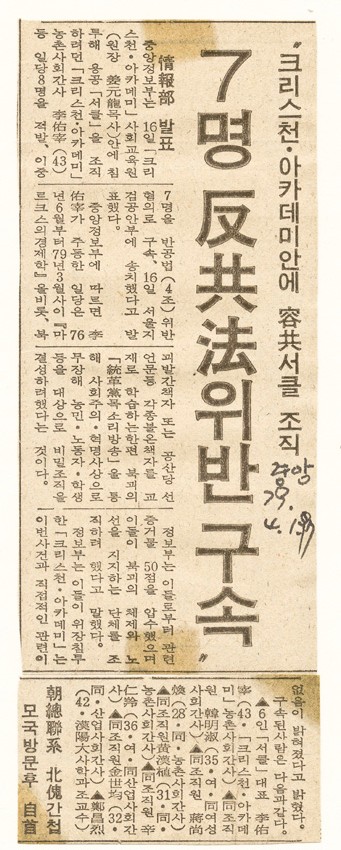 7명 반공법 위반 구속 작성일 : 2011.06.29 조회수 : 19 공유하기 페이스북으로 공유하기 페이스북으로 공유하기 URL 을 비롯, 북괴 발간책자 또는 공산당 선언문 등 각종 불온책자를 교재로 학습하고, 북괴의 ‘통혁당 목소리방송’을 통해 사회주의, 혁명사상으로 무장해 농민, 노동자, 학생 등을 대상으로 비밀조직을 결성하려 했다는 이유로 이우재 크리스챤아카데미 농촌사회 간사 등 7명을 반공법 위반 혐의로 구속했다. 관련일시 1979.04.17 노트 중앙일보 태그 신문기사 이전 한신대 신입생을 위한 내일&리더십 캠프 다음 1차 멘토 포럼 목록으로