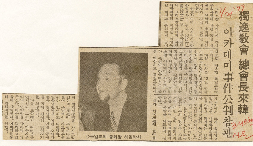 독일교회총회장-아카데미사건 공판 참관 작성일 : 2011.06.29 조회수 : 19 공유하기 페이스북으로 공유하기 페이스북으로 공유하기 URL 크리스챤아카데미 간사 구속 사건과 관련하여 독일교회 총회장 하일 박사가 내한하여 “나를 포함해서 여러분은 연약하다. 그러나 예수가 우리의 연약함을 강하게 해주신다. 예수를 증거하고 있을 때 강해진다. 이 자리를 통해 강해지기를 원하다”고 말했다. 관련일시 1979.01.21 노트 크리스챤신문 태그 신문기사 이전 한신대 신입생을 위한 내일&리더십 캠프 다음 1차 멘토 포럼 목록으로