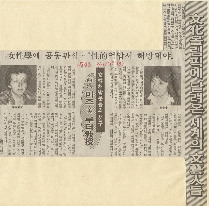 여성학과 여성 해방운동 분야에서 활동중인 최대 이론가 중의 한사람으로 꼽히는 서독의 사회학자 마리아 미즈 여사 (쾰른대 교수)와 미국의 신학자 로즈마리 레드포드 루더 여사 (조지아 하크니스대 교수)가 서울올림픽 국제학술회의 초청자로 나란히 참석, 주목을 끌었다.
