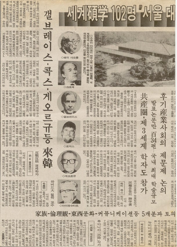 세계석학 102명 ‘서울대토론회’ 작성일 : 2011.06.29 조회수 : 17 공유하기 페이스북으로 공유하기 페이스북으로 공유하기 URL 올림픽국제학술회의의 특징은 끊임없는 분과별 토론과 대화에 의해 진행된다. 21일부터 17일간 분과별로 나흘간씩 아카데미하우스에서 숙식을 함께 하며 얻어진 결론들은 9월7, 8일 힐튼호텔의 전체회의에서 종합토론을 거쳐 88서울올림픽 국제학술회의의 최종결론으로 채택된다. 관련일시 1988.08.14 노트 조선일보 태그 신문기사 이전 한신대 신입생을 위한 내일&리더십 캠프 다음 1차 멘토 포럼 목록으로