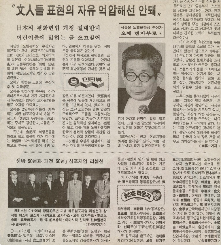 문인들 표현의 자유 억압해선 안돼-서울 온 노벨문학상 수상자 오에 겐자부로 씨 작성일 : 2011.06.29 조회수 : 23 공유하기 페이스북으로 공유하기 페이스북으로 공유하기 URL 노벨문학상 수상자인 오에 겐자부로가 크리스챤아카데와 일본의 이와나미서점이 공동주최하는 “해방50년 패전50년-화해와 미래를 위하여” 한일 심포지엄에 참석차 내한했다. 오에 겐자부로는 “치유와 화해를 추구하는 나의 휴머니즘은 서구적이지 않다. 나는 그걸 인류애적인 것이라고 본다. 한국에 와서 많은 것을 배우고 가야겠다는 생각을 한다”고 말했다. 관련일시 1995.02.02 노트 중앙일보 태그 신문기사 이전 한신대 신입생을 위한 내일&리더십 캠프 다음 1차 멘토 포럼 목록으로