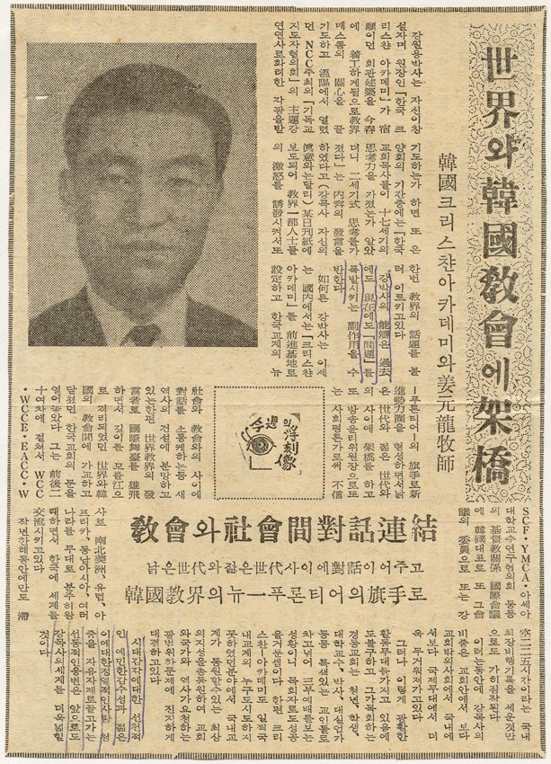 한국크리스챤아카데미와 강원용 목사: 세계와 한국교회에 가교 작성일 : 2011.06.29 조회수 : 18 공유하기 페이스북으로 공유하기 페이스북으로 공유하기 URL "시대 감각에 대한 선천적인 예민한 감수성과 젊은이에 대한 정열적인 사랑, 청중을 자유자재로 끌고 가는 선동적인 웅변은 앞으로도 강 목사의 세계를 더욱 넓힐 것이다.(스캔 사진 내용과 제목 다름 확인요)" 관련일시 1966.11.29 태그 신문기사 이전 한신대 신입생을 위한 내일&리더십 캠프 다음 1차 멘토 포럼 목록으로