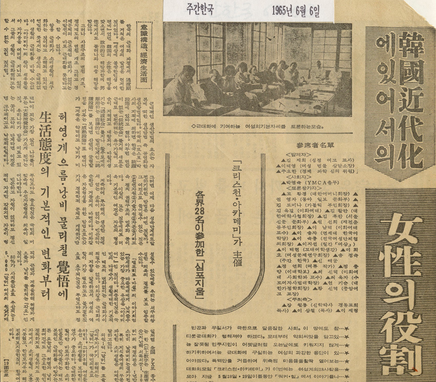 한국 근대화에 있어서의 여성의 역할 작성일 : 2011.06.29 조회수 : 18 공유하기 페이스북으로 공유하기 페이스북으로 공유하기 URL 참다운 근대화. 모태부터 악의 씨앗을 담고 있는 잘못된 민주시민이 어젯 날처럼 오는 날에도 키워지지 않게 하기 위해서는 근대화에 구실하는 여성의 과감한 용단이 있어야겠다. 독백만을 거듭하여 위축된 마음을 열어보는 대화모임이 크리스챤아카데미 주최로 열렸다. 관련일시 1965.06.06 노트 주간한국 태그 신문기사 이전 한신대 신입생을 위한 내일&리더십 캠프 다음 1차 멘토 포럼 목록으로