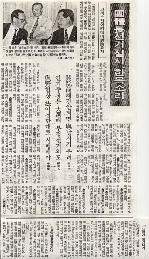 단체장 선거 실시 한목소리 작성일 : 2011.06.29 조회수 : 16 공유하기 페이스북으로 공유하기 페이스북으로 공유하기 URL 크리스챤아카데미 주최 “14대 국회개원과 한국정치의 과제” 대화모임에 2명의 대통령 후보와 민자, 민주, 국민당의원 20여 명이 참석, 단체장 선거 연기문제 등에 대한 토론을 벌였다. 김대중 대표는 개원전 해결 안되면 여당의 날치기 우려를, 정주영 대표는 단체장 선거 연기주장은 대선 때 부정선거 의도가 있는 것이라고 말했다. 관련일시 1992.06.12 노트 문화일보 태그 신문기사 이전 한신대 신입생을 위한 내일&리더십 캠프 다음 1차 멘토 포럼 목록으로