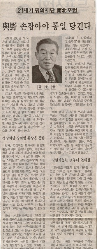 21세기 평화재단 남북포럼-강원용 작성일 : 2011.06.29 조회수 : 15 공유하기 페이스북으로 공유하기 페이스북으로 공유하기 URL 국토 분단 55년 만에 정상회담이 열리게 됐다. 첫째, 감상적인 민족애와 장밋빛 환상에 젖지 말아야 한다. 둘째, 여야를 막론하고 민족의 과제를 정략적으로 이용하는 일은 절대 없어야 한다. 셋째, 비대칭 상황에서 상호주의 관철은 잘못된 것이다. 넷째 남북간 뿌리 깊은 불신의 장벽을 더 이상 쌓지 말아야 한다. 관련일시 2000.04.14 노트 동아일보 태그 신문기사 이전 한신대 신입생을 위한 내일&리더십 캠프 다음 1차 멘토 포럼 목록으로