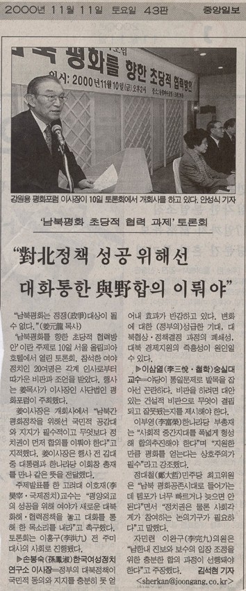 남북평화 초당적 협력과제 토론회 작성일 : 2011.06.29 조회수 : 16 공유하기 페이스북으로 공유하기 페이스북으로 공유하기 URL 사단법인 평화포럼 주최 “남북 평화를 향한 초당적 협력 과제” 토론회에서 강원용 이사장은 남북간 평화 정착을 위해선 국민적 공감대와 지지가 필수적이고 무엇보다 정치권이 먼저 합의를 이뤄야 한다고 지적하고 행사 전 김대중 대통령과 한나라당 이회창 총재를 만나 같은 뜻을 전달했다. 관련일시 2000.11.11 노트 중앙일보 태그 신문기사 이전 한신대 신입생을 위한 내일&리더십 캠프 다음 1차 멘토 포럼 목록으로