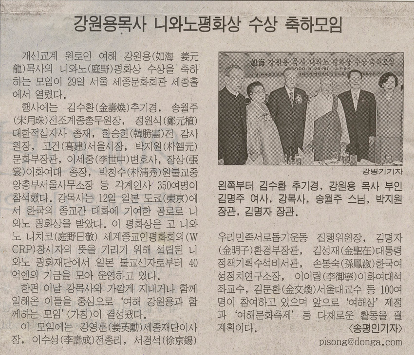 여해 강원용 목사 니와노평화상 수상 축하모임 작성일 : 2011.06.29 조회수 : 35 공유하기 페이스북으로 공유하기 페이스북으로 공유하기 URL 고 니와노 니치코 세계종교인평화회의 창시자의 뜻을 기리기 위해 설립된 니와노 평화재단에서 강원용 목사는 한국의 종교간 대화에 기여한 공로로 니와노평화상을 받았다. 이를 축하하기 위한 모임이 서울 세종문화회관 세종홀에서 열렸다. 관련일시 2000.05.30 노트 동아일보 태그 신문기사 이전 한신대 신입생을 위한 내일&리더십 캠프 다음 1차 멘토 포럼 목록으로