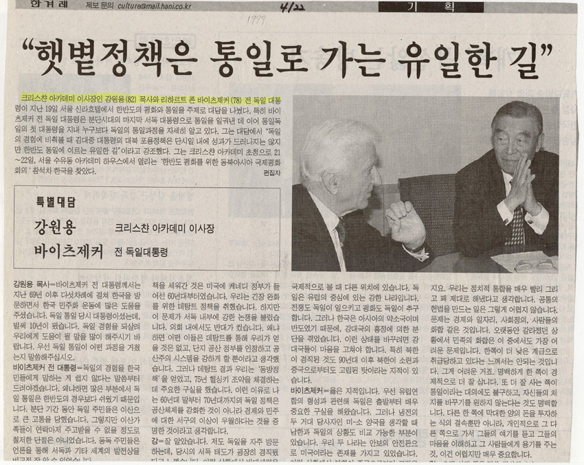 강원용 목사와 바이제커 전 독일 대통령 특별대담 작성일 : 2011.06.29 조회수 : 19 공유하기 페이스북으로 공유하기 페이스북으로 공유하기 URL 크리스챤아카데미 이사장 강원용 목사와 폰 바이제커 전 독일 대통령이 한반도의 평화와 통일을 주제로 대담을 나눴다. 바이제커 대통령은 독일의 경험에 비춰볼 때 김대중 대통령의 대북 포용정책은 단시일 내에 성과가 드러나지는 않지만 한반도 통일에 이르는 유일한 길이라고 강조했다. 관련일시 1999.04.22 노트 한겨레 태그 신문기사 이전 한신대 신입생을 위한 내일&리더십 캠프 다음 1차 멘토 포럼 목록으로