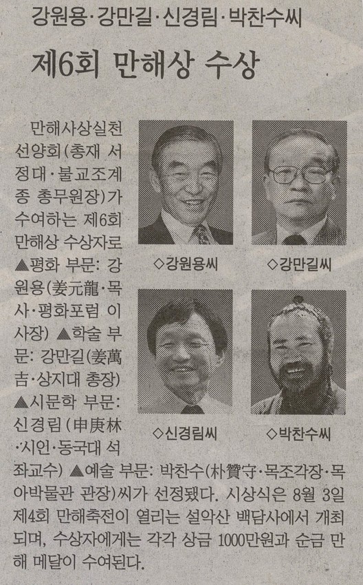 강원용 강만길 신경림 박찬수 씨 제6회 만해상 수상 작성일 : 2011.06.29 조회수 : 19 공유하기 페이스북으로 공유하기 페이스북으로 공유하기 URL 만해사상실천선양회가 수여하는 제6회 만해상 수상자로 평화 부문에 평화포럼 강원용 이사장이 선정됐다. 관련일시 2002.06.05 노트 조선일보 태그 신문기사 이전 한신대 신입생을 위한 내일&리더십 캠프 다음 1차 멘토 포럼 목록으로