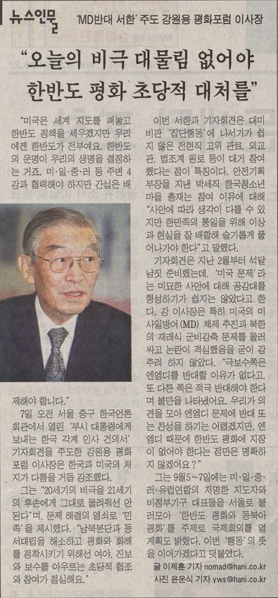 ‘MD 반대 서한 주도 강원용 평화포럼 이사장 작성일 : 2011.06.29 조회수 : 18 공유하기 페이스북으로 공유하기 페이스북으로 공유하기 URL 부시 대통령에게 보내는 한국 각계 인사 건의서 기자회견을 주도한 강원용 이사장은 20세기의 비극을 21세기의 후손에게 물려줘선 안 된다며, 남북분단과 동서대립을 해소하고 평화와 화해를 정착시키기 위해선 여야, 진보와 보수를 아우르는 초당적 협조와 참여가 절실하다고 강조했다. 관련일시 2001.09.01 노트 한겨레 태그 신문기사 이전 한신대 신입생을 위한 내일&리더십 캠프 다음 1차 멘토 포럼 목록으로