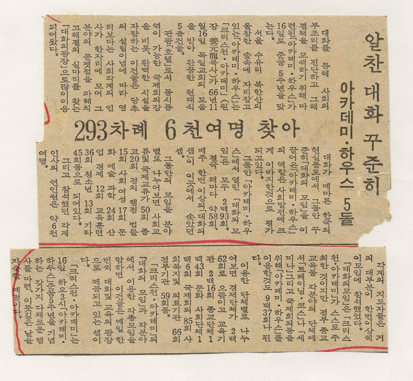 크리스챤아카데미 창립 5주년 작성일 : 2011.06.29 조회수 : 17 공유하기 페이스북으로 공유하기 페이스북으로 공유하기 URL 크리스챤아카데미는 대화가 메마른 한국의 현실 풍토에서 그동안 꾸준히 ‘대화의 모임’을 이끌며 사회발전에 크게 이바지한 것으로 평가되고 있다. 창립 5년 동안 대화모임은 293회, 약 6천여 명이 찾았고, 해마다 약58회 대화모임이 열렸으니, 매주 한 번 이상의 ‘대화의 샘’이 이곳에서 솟았던 셈이다. 관련일시 1971.11.13 노트 서울신문 태그 신문기사 이전 한신대 신입생을 위한 내일&리더십 캠프 다음 1차 멘토 포럼 목록으로