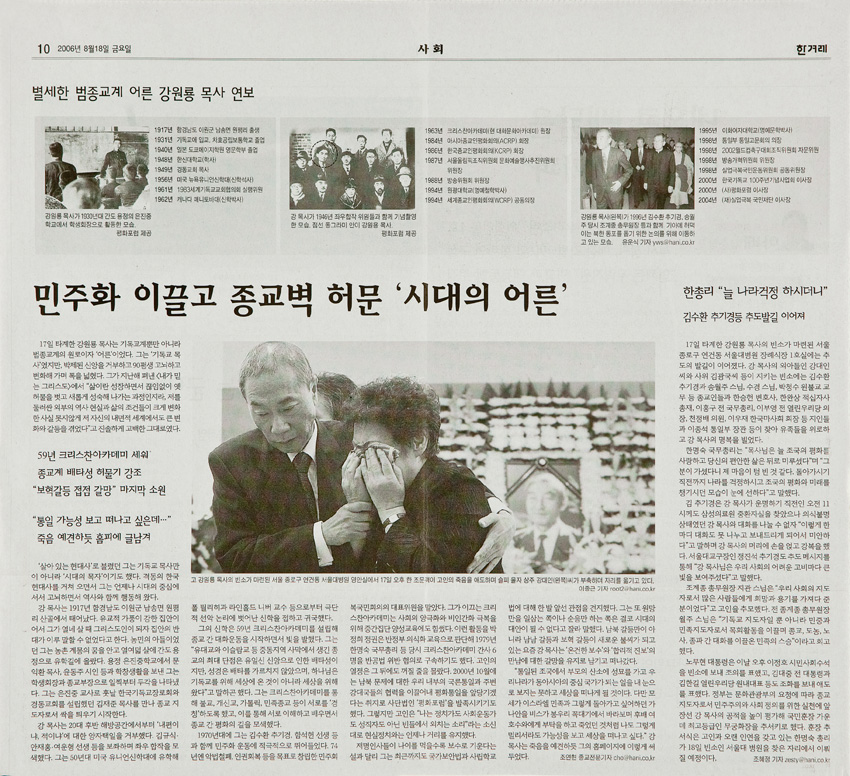별세한 범종교계 어른 강원용 목사 (MG_0001) 작성일 : 2011.06.29 조회수 : 19 공유하기 페이스북으로 공유하기 페이스북으로 공유하기 URL "“민주화 이끌고 종교벽 허문 ‘시대의 어른’”“59년 크리스챤 아카데미 세워 종교계 배타성 허물기 강조”“보혁갈등 접점 갈망” 마지막 소원" 관련일시 2006.08.18 노트 한겨레 태그 신문기사 이전 한신대 신입생을 위한 내일&리더십 캠프 다음 1차 멘토 포럼 목록으로