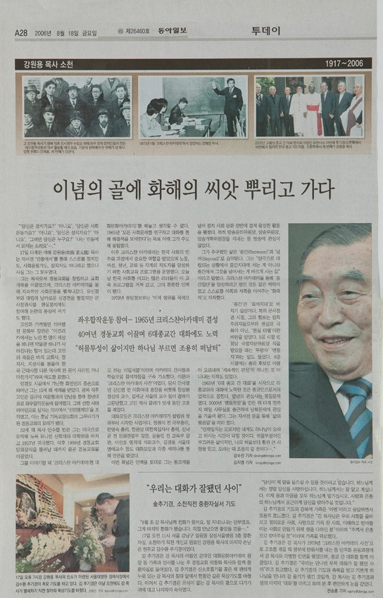 투데이: 강원용 목사 소천 (MG_9979) 작성일 : 2011.06.29 조회수 : 18 공유하기 페이스북으로 공유하기 페이스북으로 공유하기 URL "“이념의 골에 화해의 씨앗 뿌리고 가다”“40여년 경동교회 이끌며 6대종교간 대화에도 노력”김추기경, 소천직전 중환자실서 기도 “우리는 대화가 잘됐던 사이”" 관련일시 2006.08.18 노트 동아일보 태그 신문기사 이전 한신대 신입생을 위한 내일&리더십 캠프 다음 1차 멘토 포럼 목록으로
