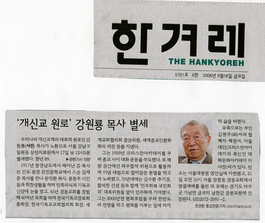 개신교 원로 강원용 목사 별세 (여해사업회006) 작성일 : 2011.06.29 조회수 : 16 공유하기 페이스북으로 공유하기 페이스북으로 공유하기 URL 우리나라 개신교계의 대표적 원로인 강원용 목사가 노환으로 서울 강남구 일원동 삼성의료원에서 17일 낮 12시 5분 별세했다. 향년 89. 관련일시 2006.08.18 노트 한겨레 태그 신문기사 이전 한신대 신입생을 위한 내일&리더십 캠프 다음 1차 멘토 포럼 목록으로