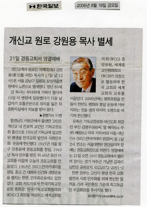개신교 원로 강원용 목사 별세 (여해사업회011) 작성일 : 2011.06.29 조회수 : 16 공유하기 페이스북으로 공유하기 페이스북으로 공유하기 URL 정부는 고인이 평생 한국교회 발전과 사회 민주화를 위해 헌신한 업적을 기려 국민훈장 가운데 최고등급인 무궁화장을 추서키로 했다. 한편 영결예배는 21일 오전 10시 경동교회에서 열린다. 관련일시 2006.08.18 노트 한국일보 태그 신문기사 이전 한신대 신입생을 위한 내일&리더십 캠프 다음 1차 멘토 포럼 목록으로